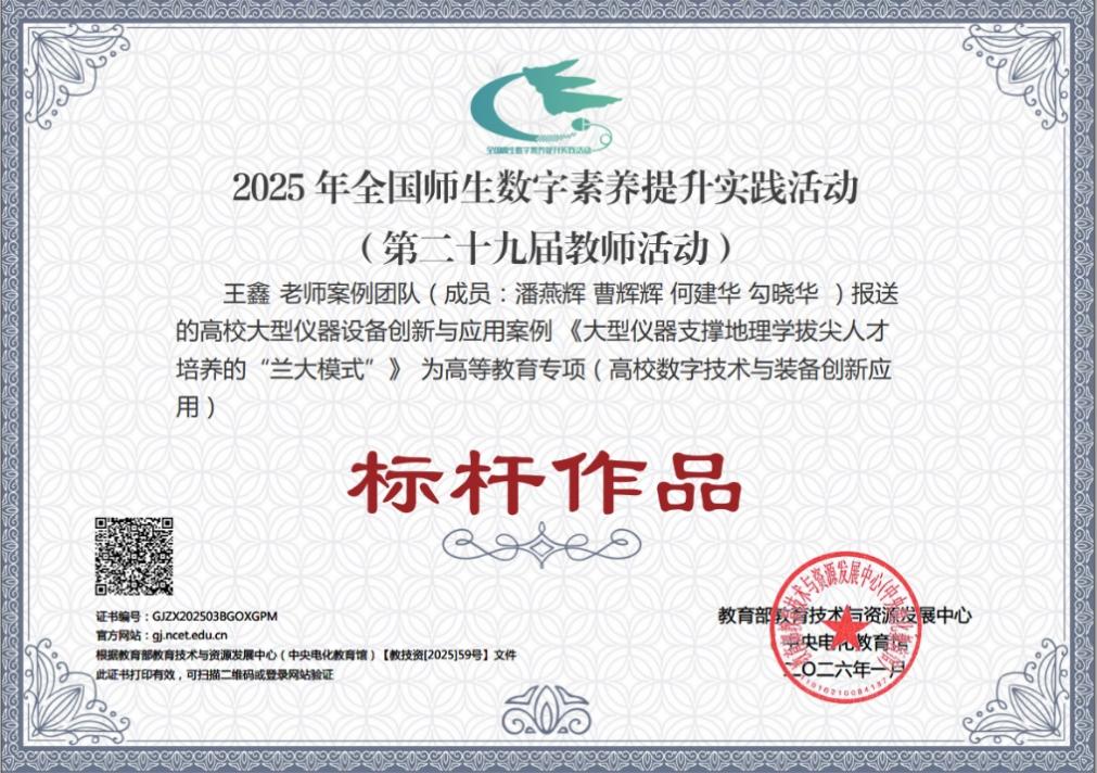 近日,教育部教育技术与资源发展中心(中央电化教育馆)公布了2025年全国师生数字素养提升实践活动案例入选结果。兰州大学资源环境学院西部环境教育部重点实验室(完成人:王鑫、潘燕辉、曹辉辉、何建华、勾晓华)报送的高校大型仪器设备创新与应用案例——《大型仪器支撑地理学拔尖人才培养的“兰大模式”》,获评高等教育专项(高校数字技术与装备创新应用)年度标杆作品。